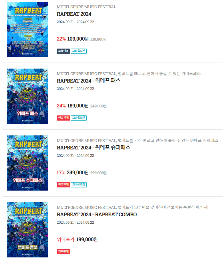 - 랩비트 2024 페스티벌 위메프 슈퍼패스와 위메프 패스, 일반 티켓 혜택 비교