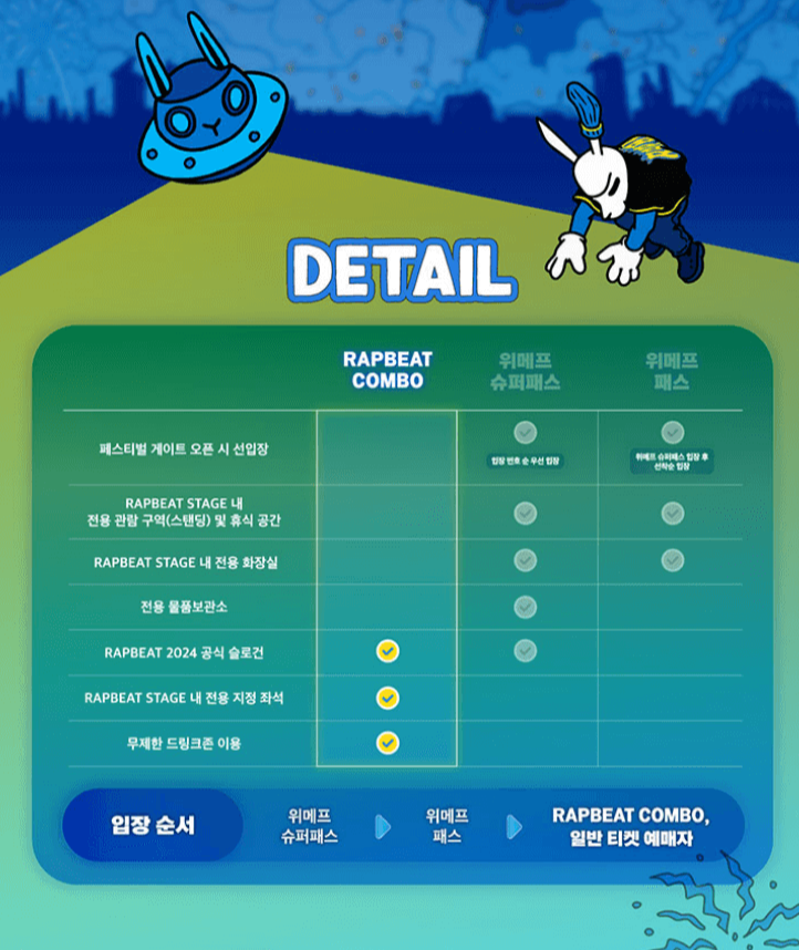 - 위메프 슈퍼패스 예매자 입장 → 위메프 패스 예매자 입장 → 랩비트 콤보 및 일반 예매자 입장
