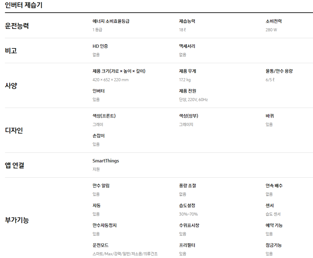 스마트싱스(SmartThings) 앱 연동으로 바쁜 워킹맘에게 편리한 기능을 제공하며 무소음 기능과 공기 청정 필터 장착으로 제습기 외에 공기 청정기능도 겸할 수 있어 아이가 있는 집에 추천드리고 싶습니다.